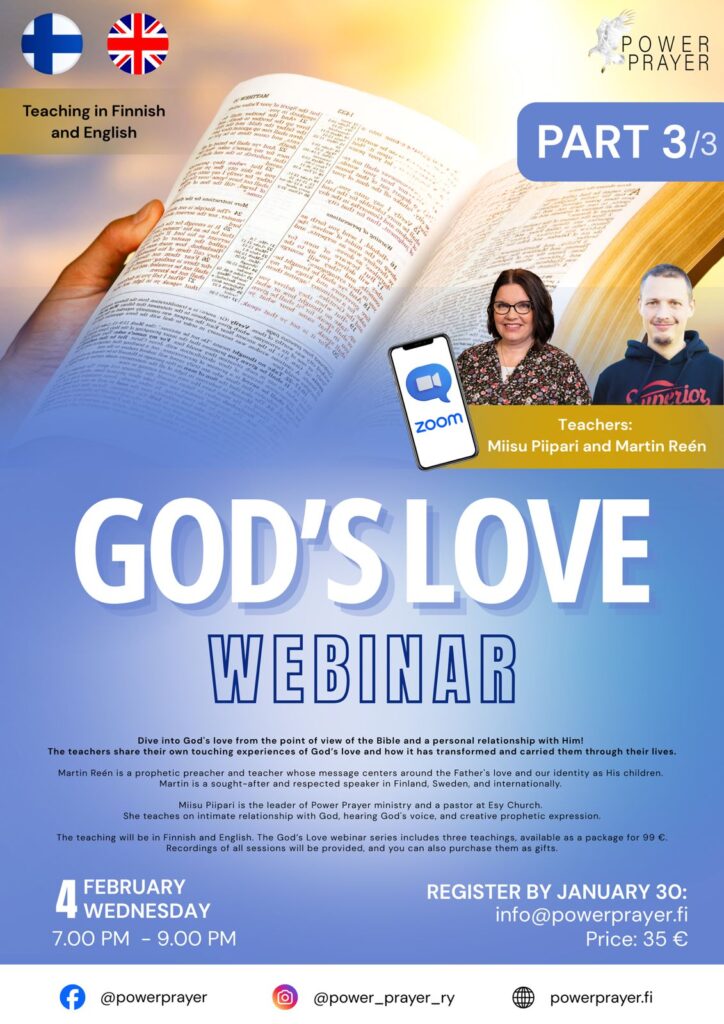 Syvenny Jumalan rakkaauteen Raamatun ja henkilökohtaisen jumalasuhteen näkökulmasta! Sarjan 1. osa oli elokuussa 2025 ja toinen osa tulee 28.1. Voit tilata edelliset osat yksittäisinä tallenteina hintaan 35€ tai kolmen webinaarin pakettina alehintaan 99€.