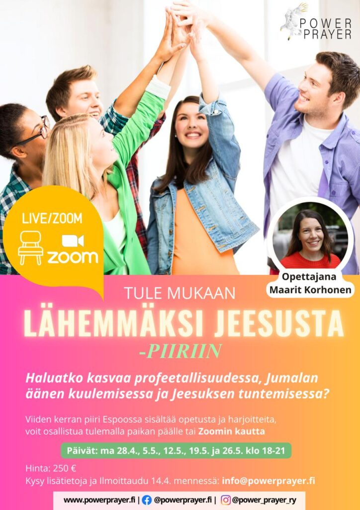 Viiden kerran Lähemmäksi Jeesusta -piiri sisältää opetusta ja harjoitteita. Kokoonnumme Espoon Friisilässä Power Prayerin uusissa tiloissa tai voit myös liittyä mukaan Zoom-etäyhteydellä.