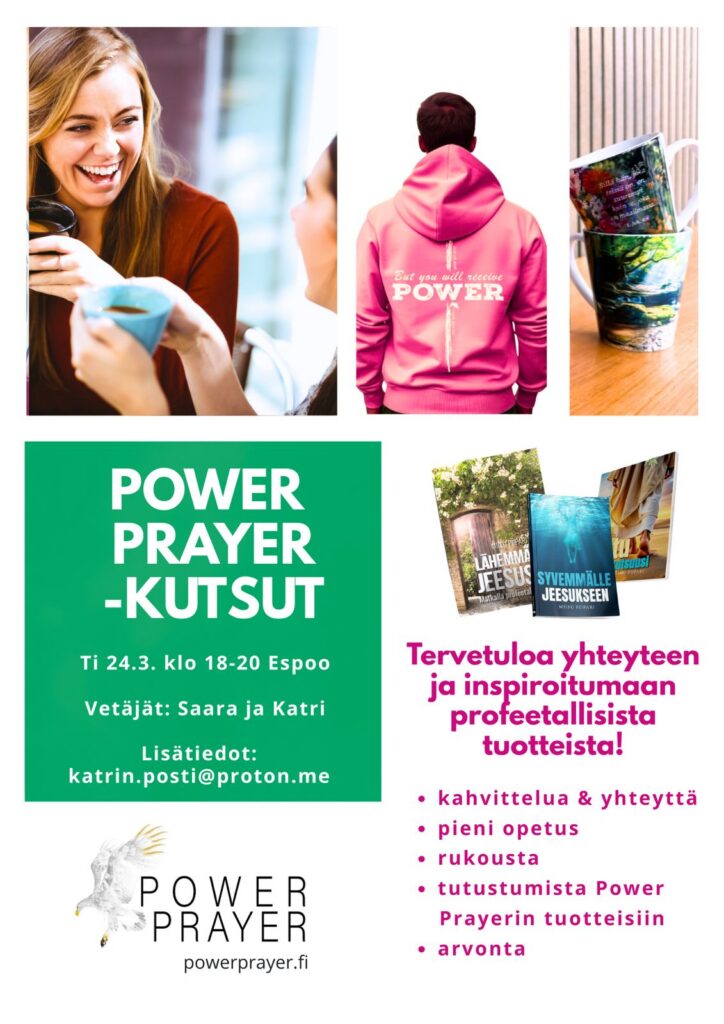 Nautitko leppoisasta kahvihetkestä arjen keskellä Pyhän Hengen läsnäolossa ja mukavassa seurassa samanhenkisten kanssa? Kiinnostaako sinua samalla tutustua Power Prayerin profeetallisiin tuotteisiin leppoisasti sohvalta käsin?