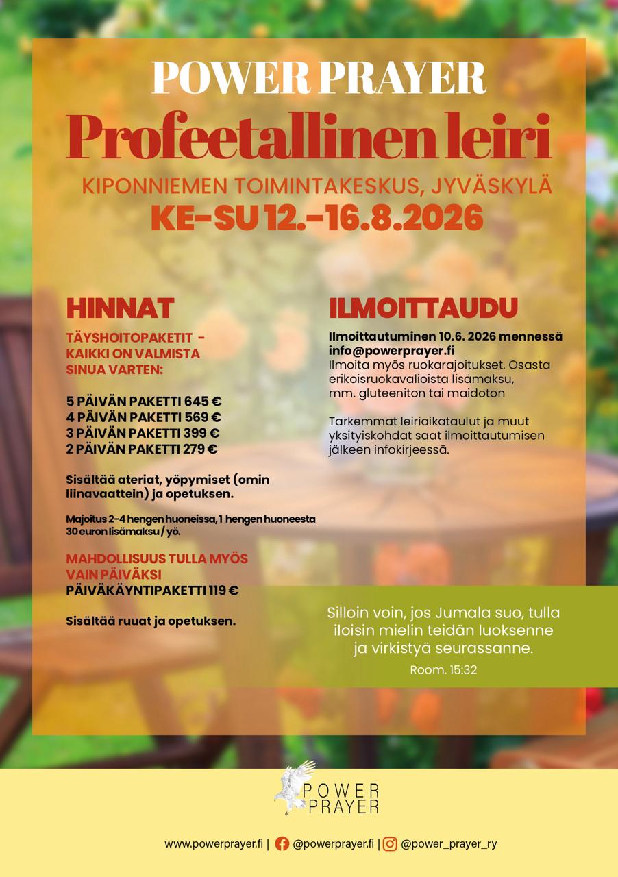 Tervetuloa jo perinteeksi muodostuneelle Power Prayerin kesäleirille! Jos olet ollut mukana aiemmin, tiedätkin, mitä odottaa leiriltä. Ja jos et vielä ole osallistunut, niin olisiko nyt sinun aikasi? Jumalalla on niin paljon annettavaa juuri sinulle. Olet sydämellisesti tervetullut mukaan!
