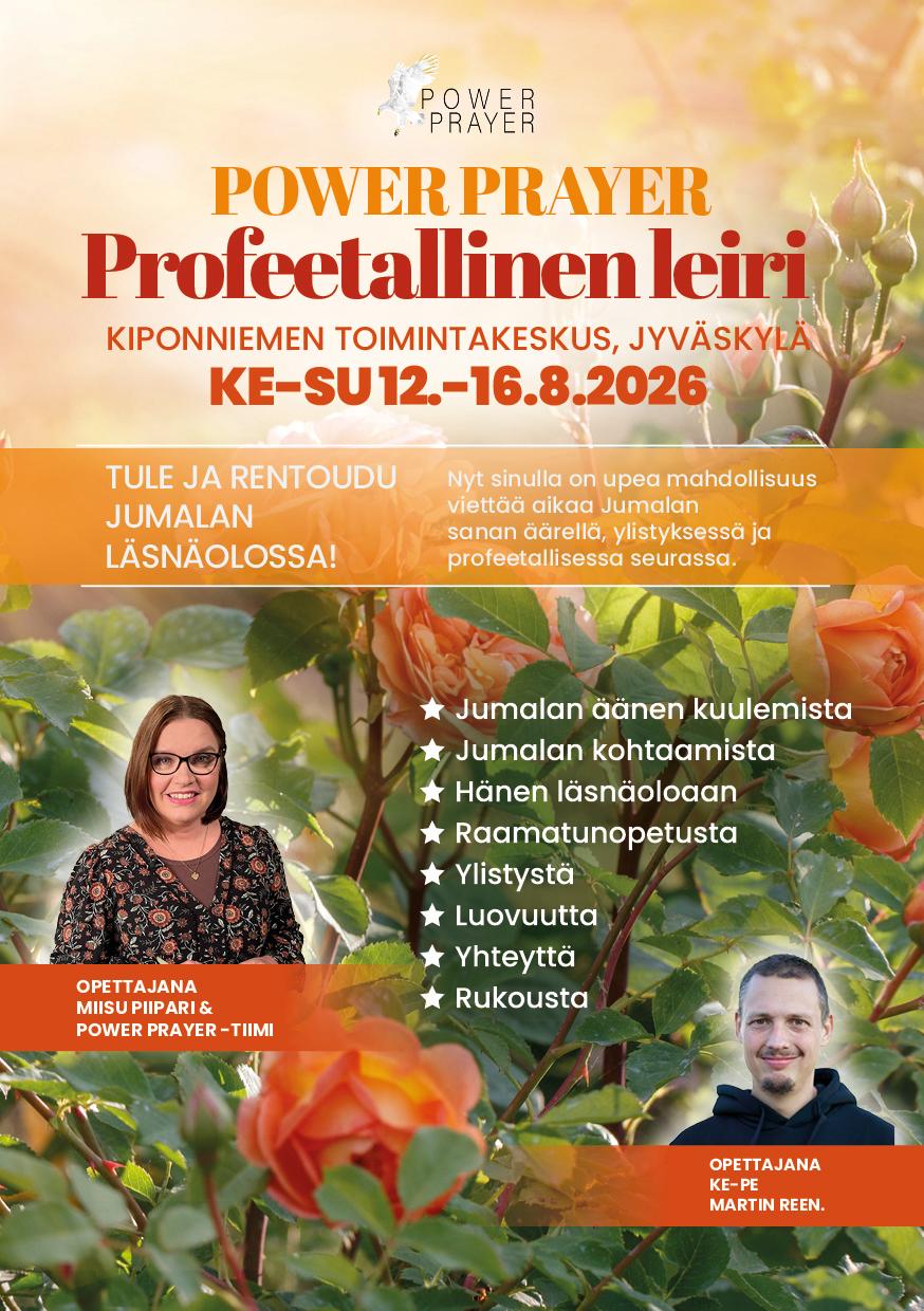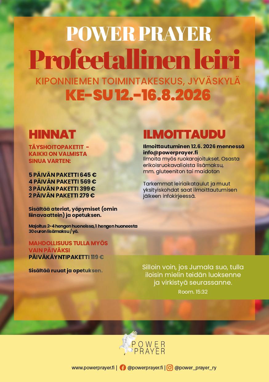 Tervetuloa jo perinteeksi muodostuneelle Power Prayerin kesäleirille! Jos olet ollut mukana aiemmin, tiedätkin, mitä odottaa leiriltä. Ja jos et vielä ole osallistunut, niin olisiko nyt sinun aikasi. Jumalalla on niin paljon annettavaa juuri sinulle. Olet sydämellisesti tervetullut mukaan!