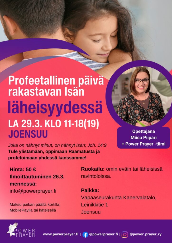 Tervetuloa Joensuuhun! Tarjolla on jotain uutta ja raikasta Taivaallisesta Isästämme. Hän haluaa kohdata juuri sinut ja puhua sinulle. Päivän aikana ylistetään, rukoillaan ja syvennetään ymmärrystä Hänestä.