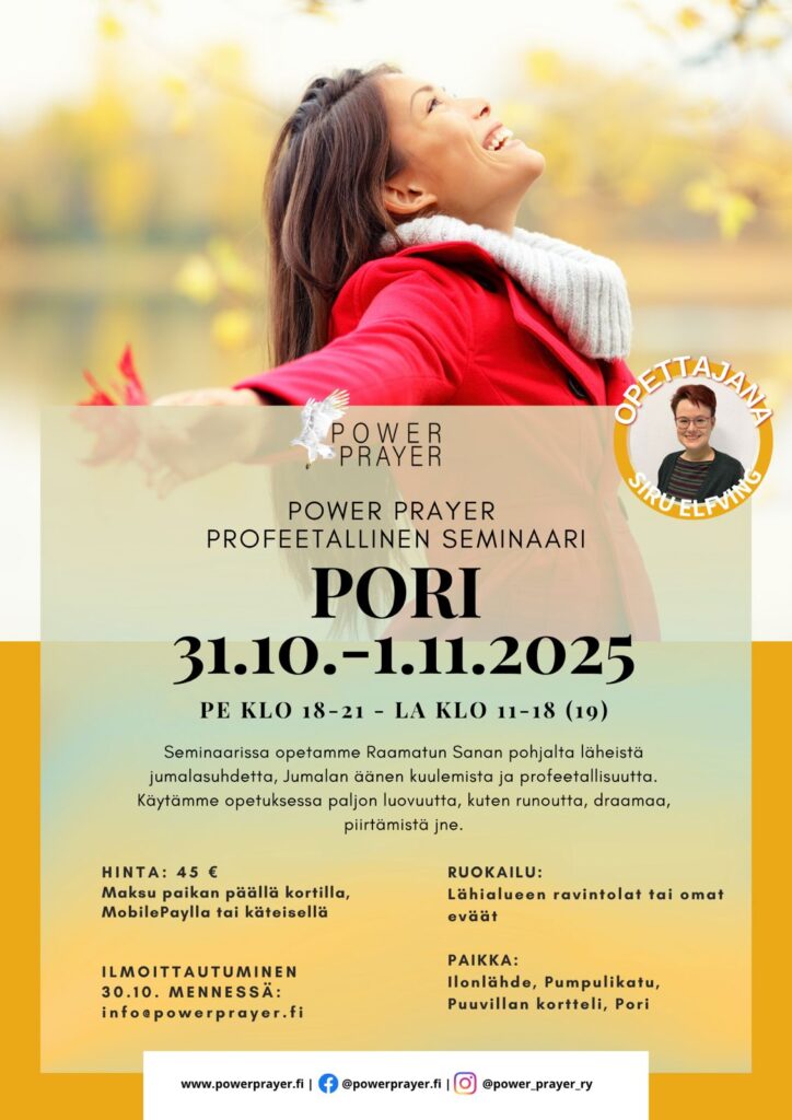 Tervetuloa Poriin! Tarjolla sukellusta Jumalan äänen kuulemiseen ja profeetallisuuteen. Harjoittelemme profeetallisuutta erilaisin luovin keinoin. Tule virkistymään, uudistumaan ja vahvistumaan yhteydestä ja erityisesti tule kohtaamaan Jeesus. Tule ja tuo ystäväsikin!