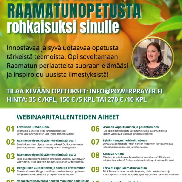 You’ll also save money if you purchase 5 webinar (voice) recordings at once. You can choose any 5 webinars and buy them at a discounted total price of 150 €. When purchased individually, a webinar costs 35 €. To make a purchase, send an email to: info@powerprayer.fi.