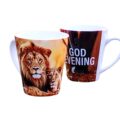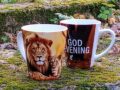 Mukin teksti toivottaa hyvän illan sijasta (good evening) Jumalan iltaa (God evening)! Tässä kartionmallisessa mukissa on näyttävä painatus, jossa majesteettinen leijonapari tarkkailee levollisena ja kiitollisena mennyttä päivää, sillä Jumalalla on kaikki hallinnassa.
