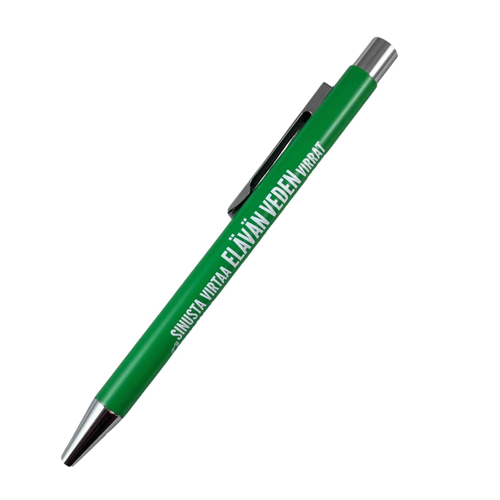 Kestävä ja laadukas vihreä kynä, missä teksti mukailee raamatuntekstiä: Joka uskoo minuun, niinkuin Raamattu sanoo, hänen sisimmästään on juokseva elävän veden virrat” (Johannes 7:38).