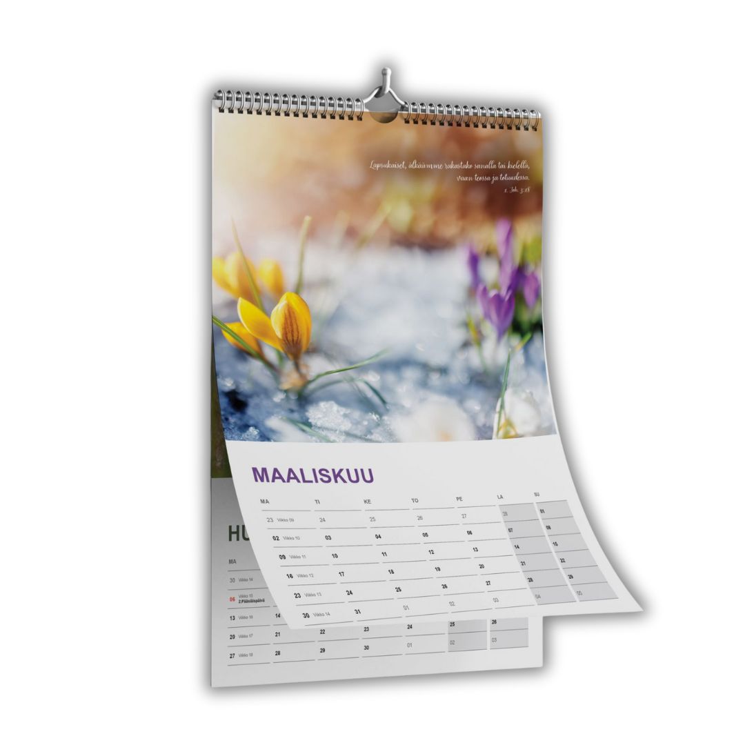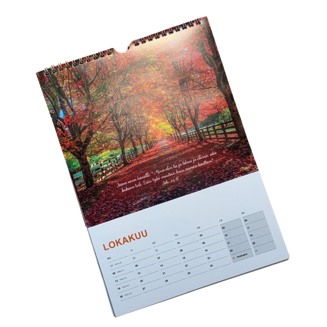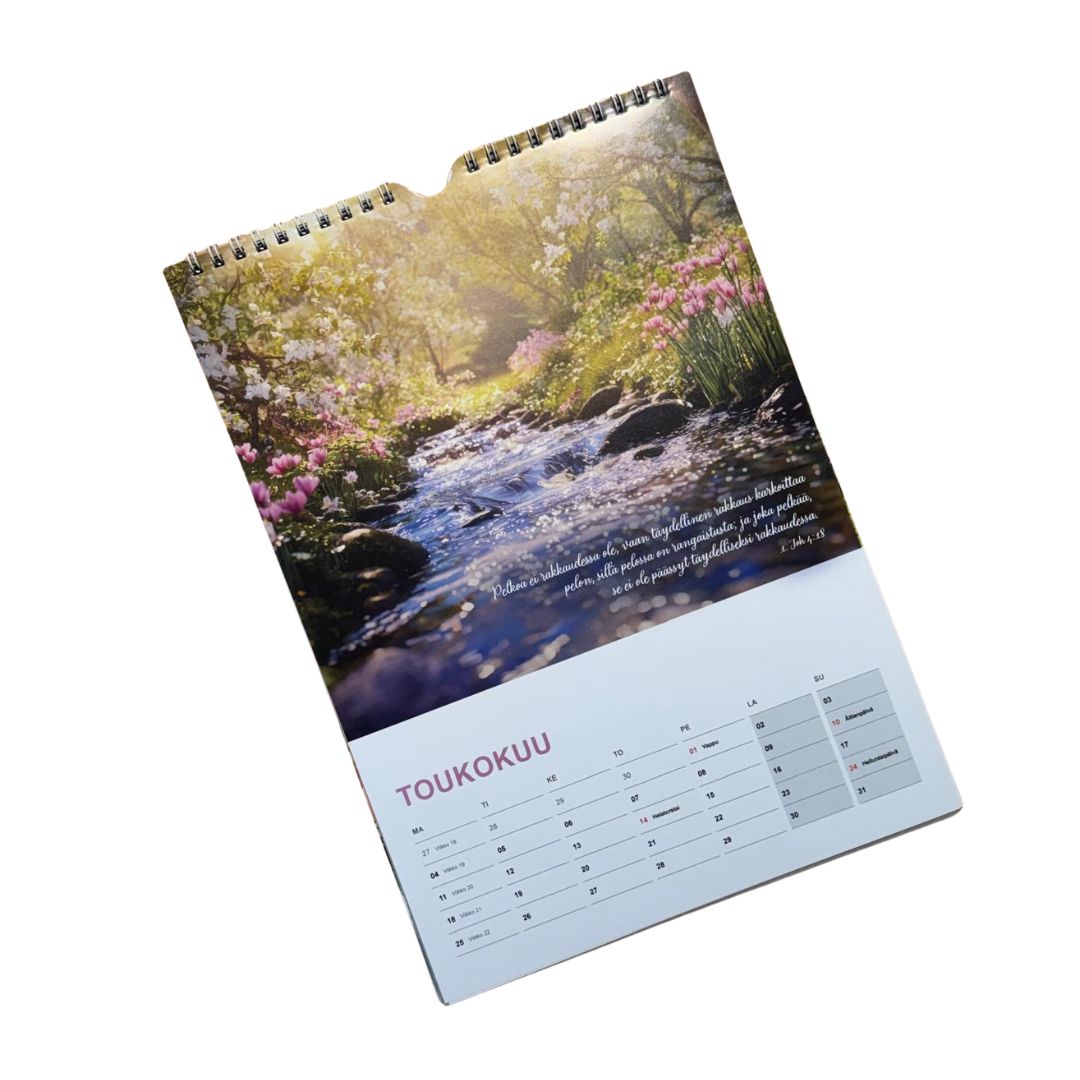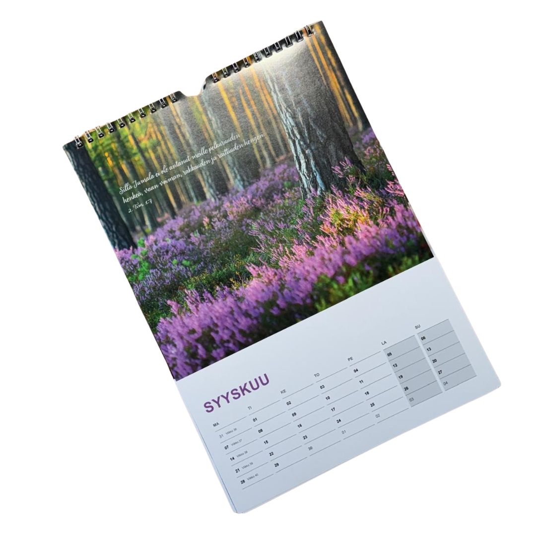Haluatko sinä laittaa seinällesi kalenterin, jossa on kauniita luontokuvia ja vuoden jokaiselle kuukaudelle puhutteleva, rohkaiseva ja lohduttava raamatunlause? Kuvat ilmentävät Jumalan luomaa luontoa sen kaikessa kauneudessaan ja raaamatunlauseet täydentävät kokonaisuuden.