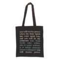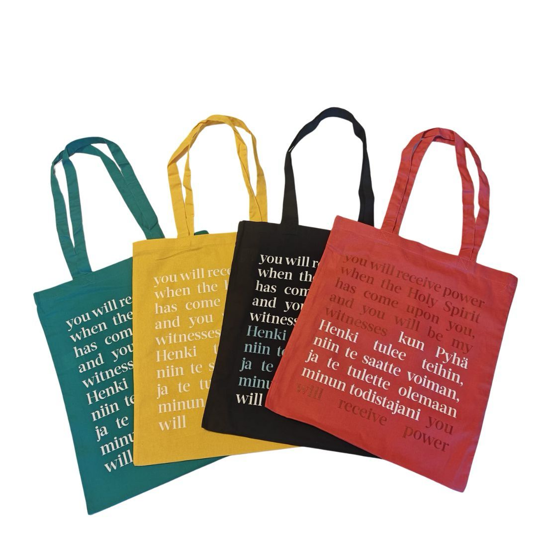 Tässä pehmeä ja ihana kassi meille kaikille Jeesuksen todistajille. Kassin toisella puolella on jatkuvana virtana teksti Apostolien teoista 1:8 ensin englanniksi ja siitä se jatkuu saumattomasti suomen kielellä: ”… kun Pyhä Henki tulee teihin, niin te saatte voiman, ja te tulette olemaan minun todistajani”. Aamen, näin tapahtukoon!