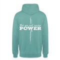 Pehemän turkoosi huppari, jonka selässä on puhutteleva printti But you will receive Power = Te saatte voiman – Apostolien teot 1:8. Näetkö sinä selässä ristin vai ehkä miekan? Edessä rinnassa on pienikokoinen Power Prayer -logo.