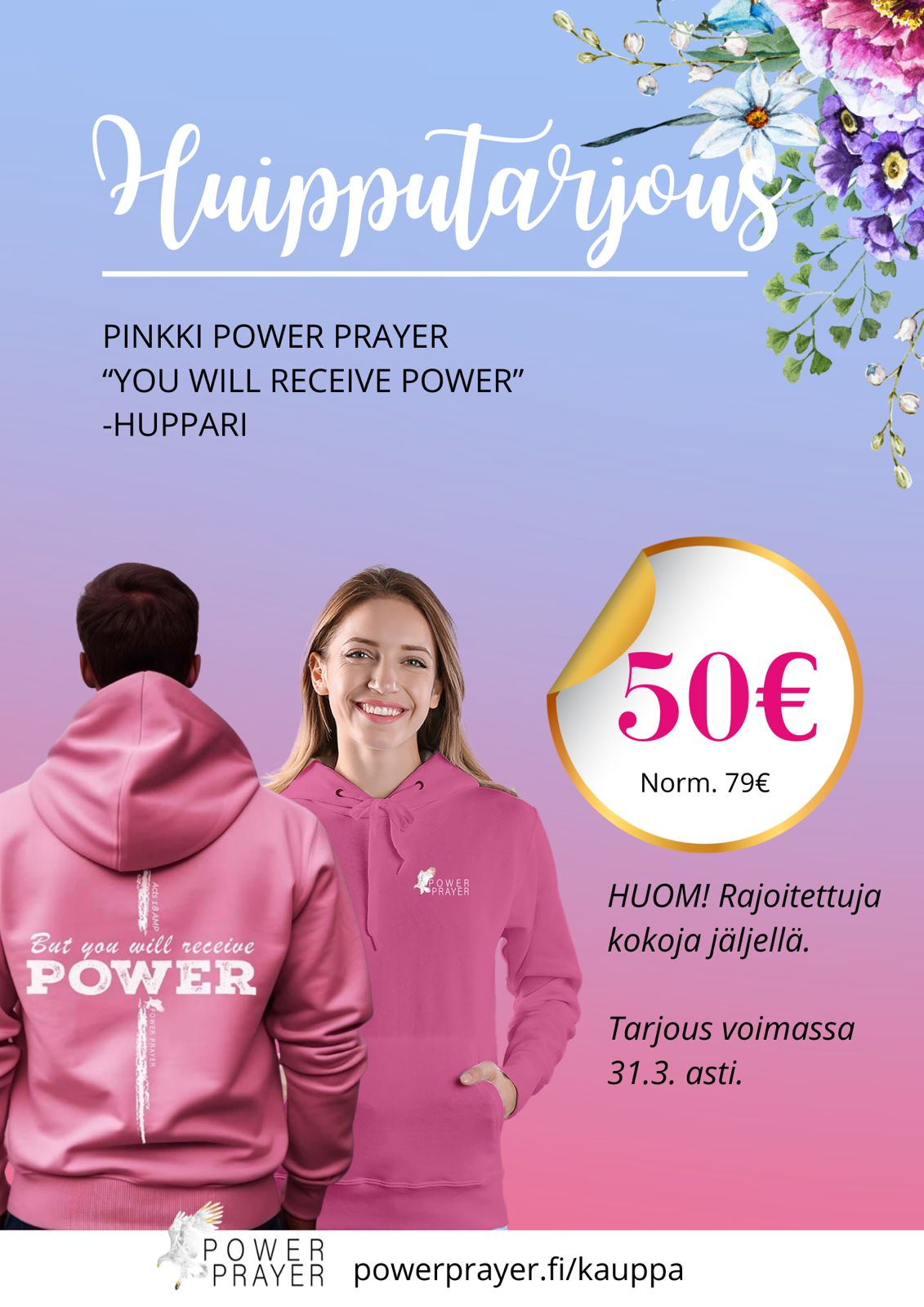 Nyt tämä huppari upeassa maaliskuun tasaraha-alessa: saat tämän ihanan, Pyhän Hengen voimaa pursuavan hupparin hintaan 50 €! Lue lisää tästä lämpimästä, keväisen värisestä ja iloa pursuavasta tuotteesta.