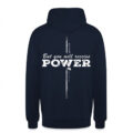 Pyhän Hengen voimaa ja ristin työtä julistava huppari, jonka selässä on puhutteleva printti But you will receive Power = Te saatte voiman – Apostolien teot 1:8. Näetkö sinä selässä ristin vai ehkä miekan? Sininen väri Raamatussa symboloi Pyhää Henkeä. Edessä rinnassa on pienikokoinen Power Prayer -logo.